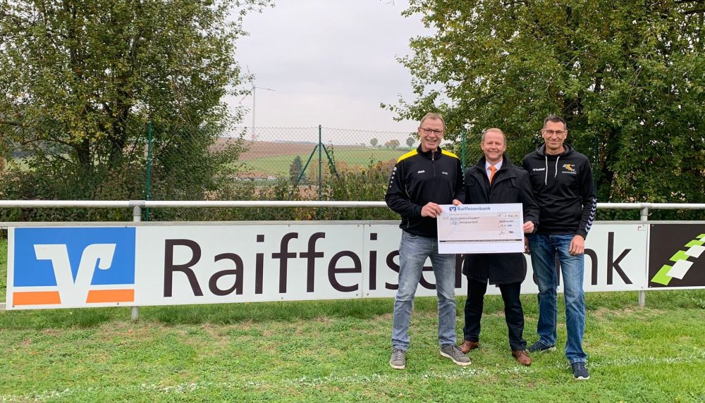 Überreicht wurde die Spende von Andreas Scheuerer (mittig im Bild), Marktbereichsleiter Raiba Hemau / Painten / Beratzhausen. Stellvertretend für unseren DJK-SV Oberpfraundorf nahmen die Vorsitzenden Andreas Bleyer (links im Bild) und Manfred Meierhofer (rechts im Bild) den Spendenscheck entgegen.