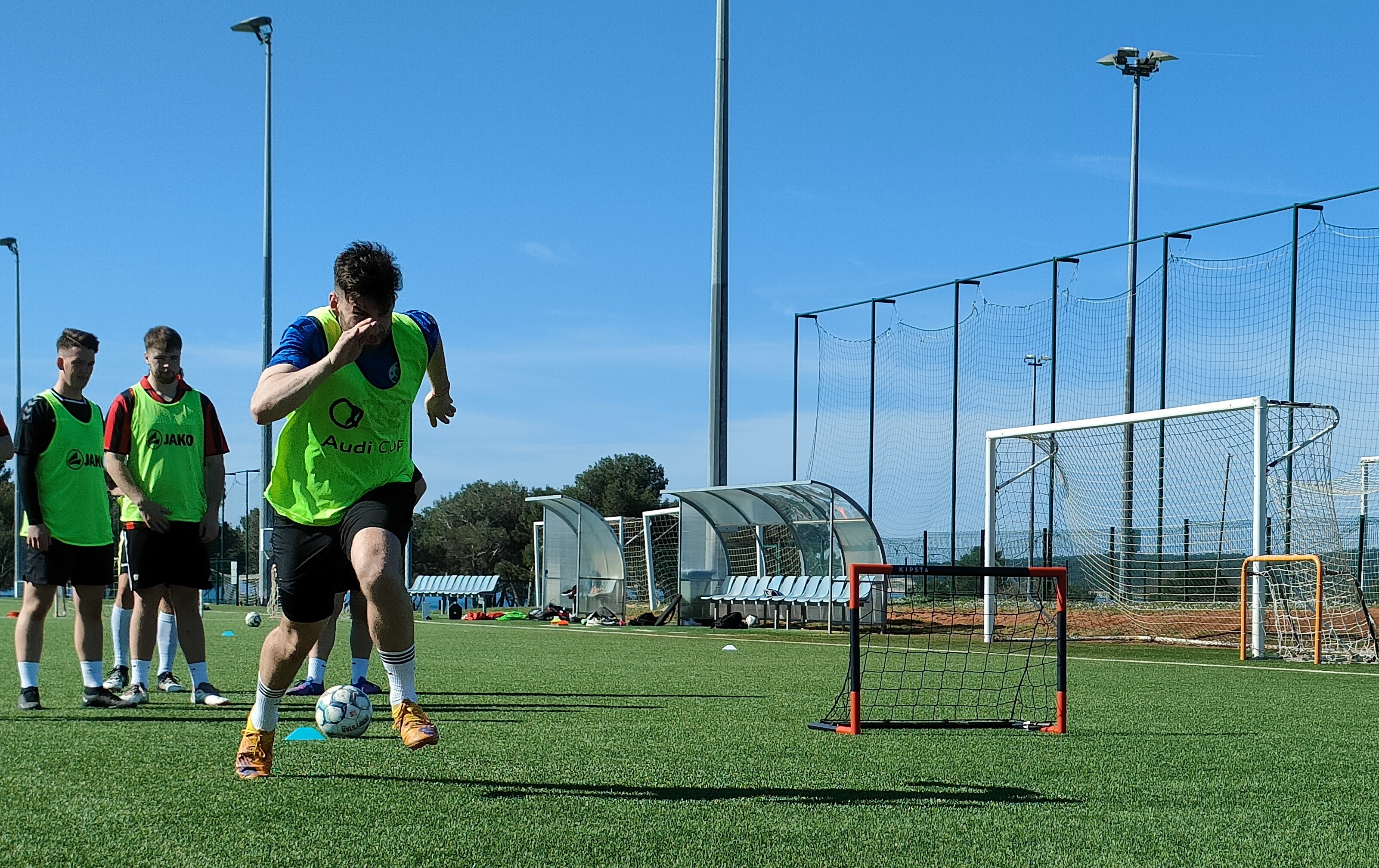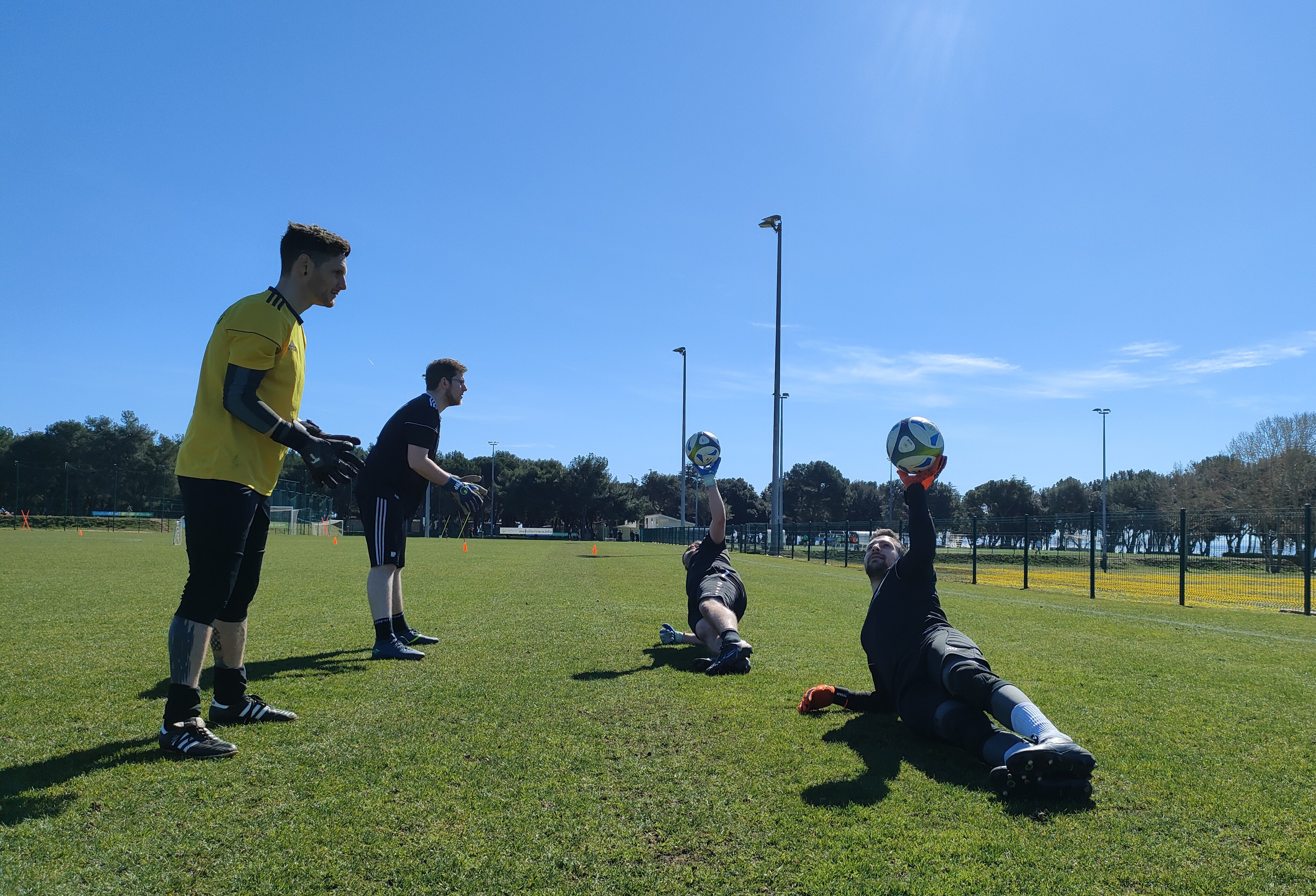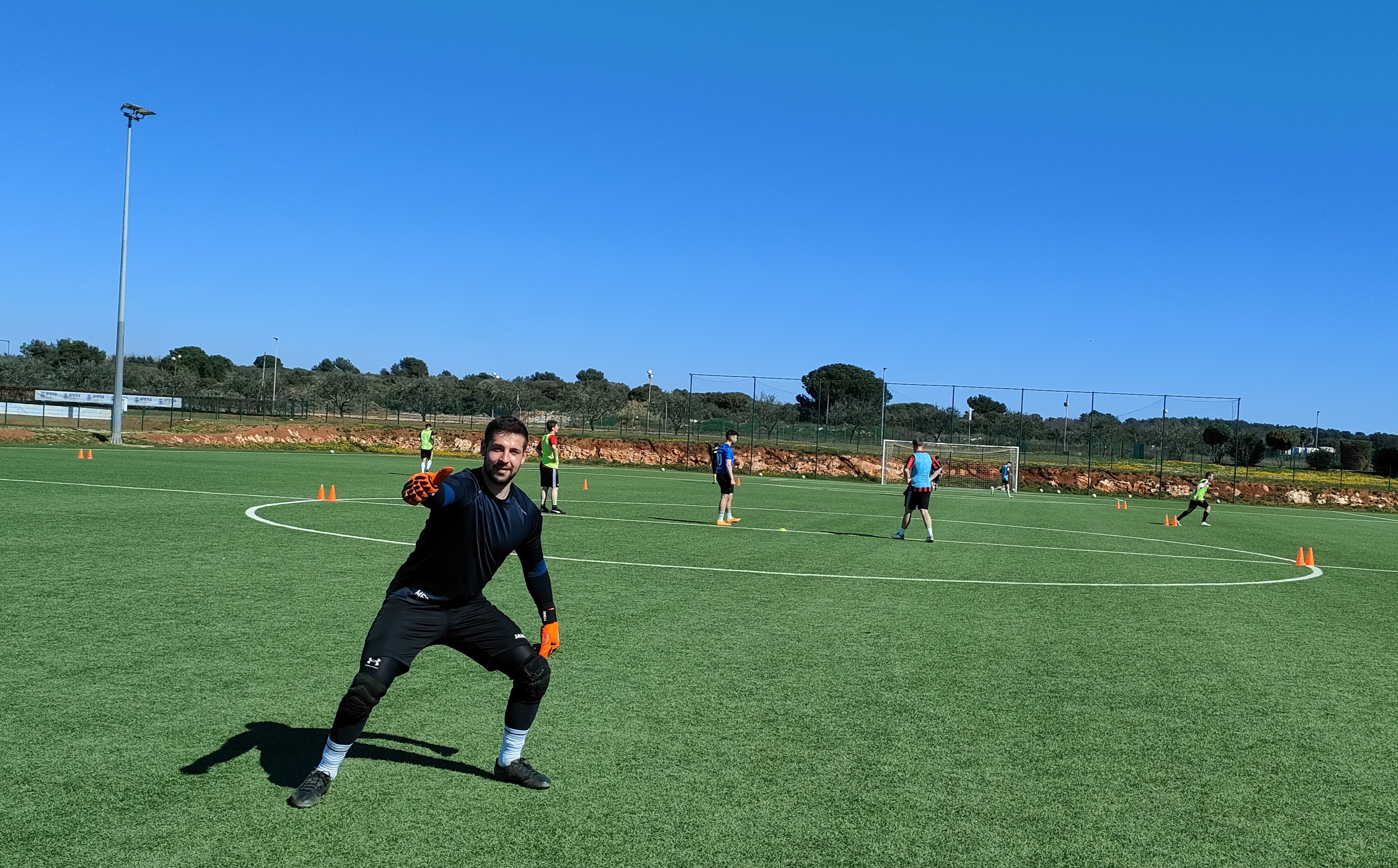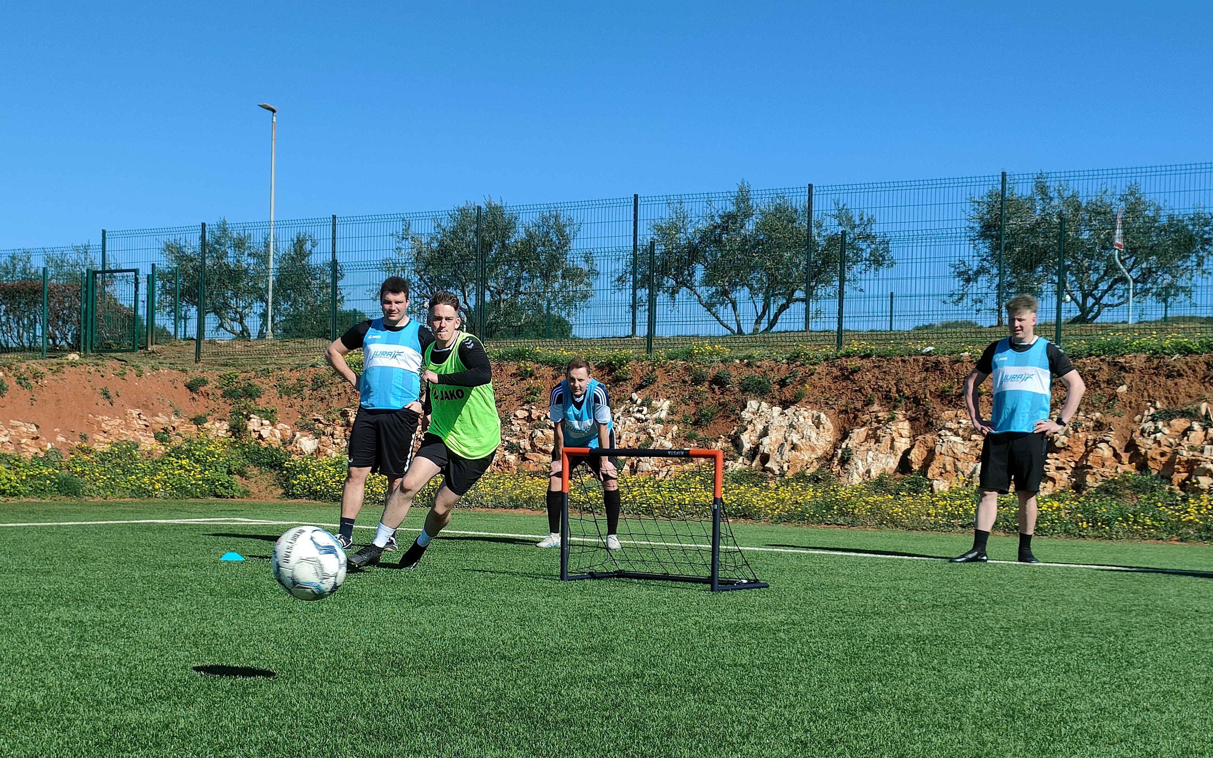 Spätestens am Freitag sollte das Urlaubsfeeling dann aber endgültig dem Sportgedanken weichen. Pünktlich um 7 Uhr startete der Tag mit einem gemeinsamen Morgenlauf am Meer. Unter der Anleitung unseres Co- und Fitnesstrainers Daniel gab es einen 5km langen Lauf zum wach werden. Im Anschluss an das Frühstück ging es auch direkt weiter zum ersten Training. Nach dem Warm-up, dass direkt auf dem Weg zu den Plätzen durchgeführt wurde, teilte sich die Mannschaft auf. Während die Feldspieler an ihrer Defensivtaktik arbeiteten, nutzten die Torhüter die Zeit für sich. Die Einheit der Keeper wurde von Co- und Torwarttrainer Phil dazu genutzt, um ihre Beweglichkeit und Technik zu verbessern. Nach dem die Übungen geschafft waren, nutzen die ein oder anderen Ihre Freizeit zur Erholung am Meer oder dem hoteleigenen Pool.