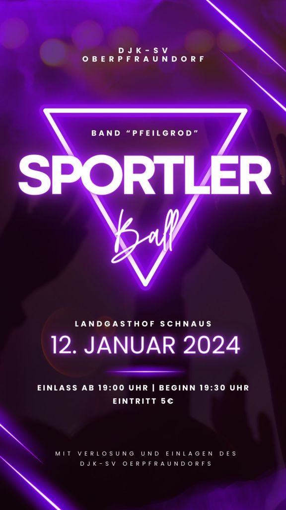 Es ist endlich soweit, am 12. Januar 2024 findet wieder unser traditioneller Sportlerball statt. Jeder der mal wieder Lust hat die Faschingskostüme aus dem Schrank zu holen und gerne zu guter Musik das Tanzbein schwingt, ist herzlich eingeladen. Die musikalische Untermalung des Abends gestaltet „Pfeilgrod“ und der Eintrittspreis beträgt 5 Euro pro Person.