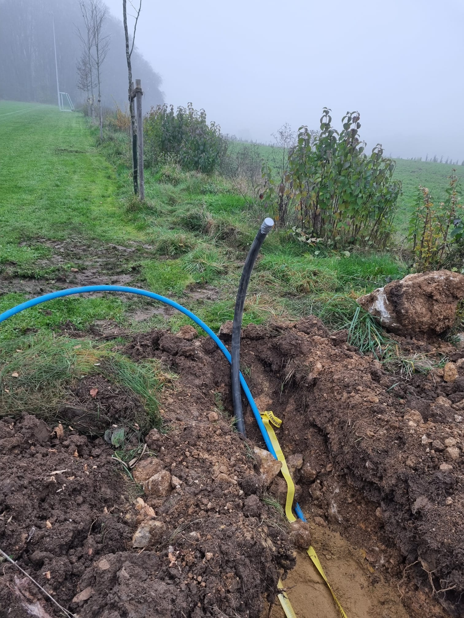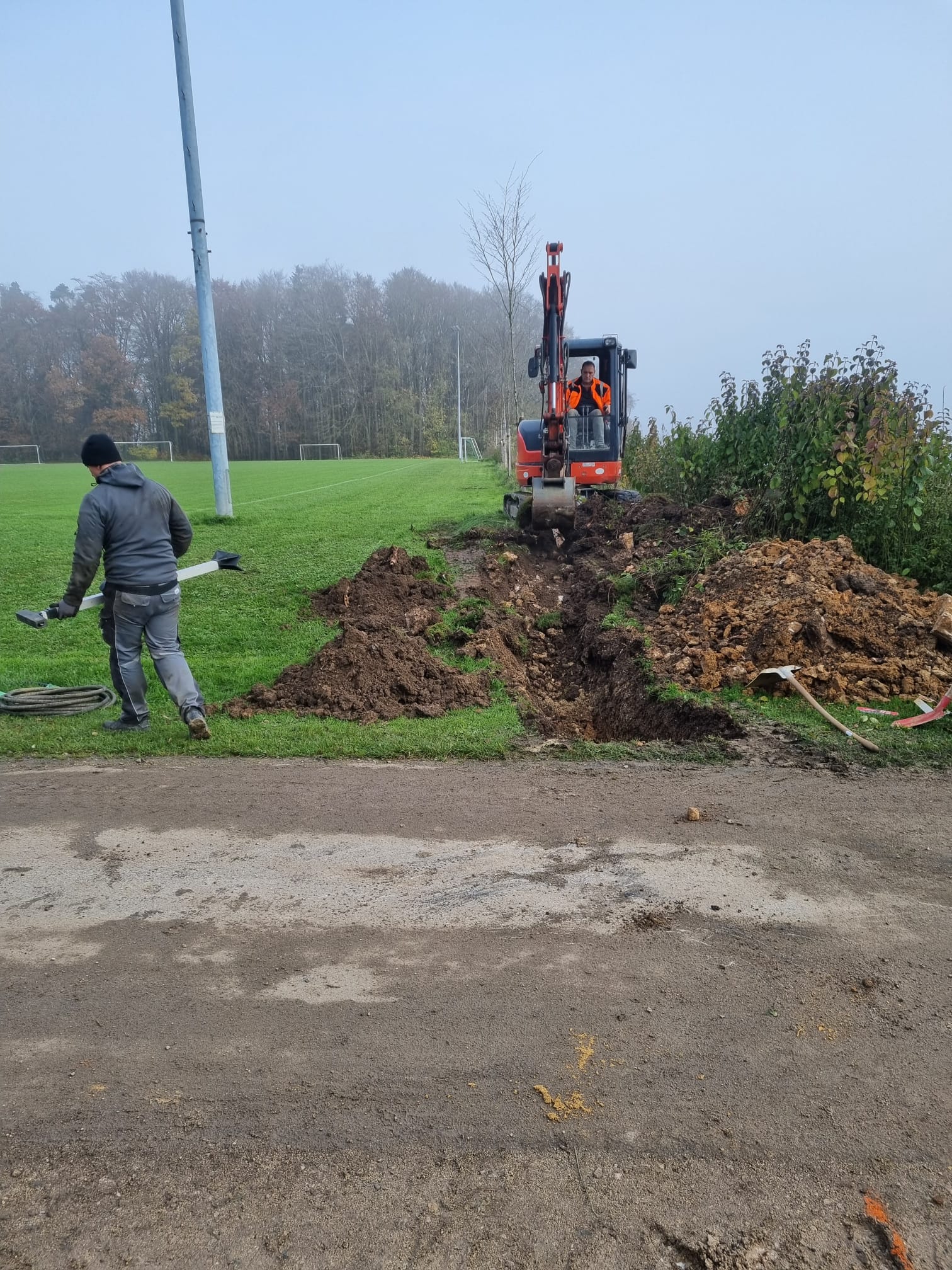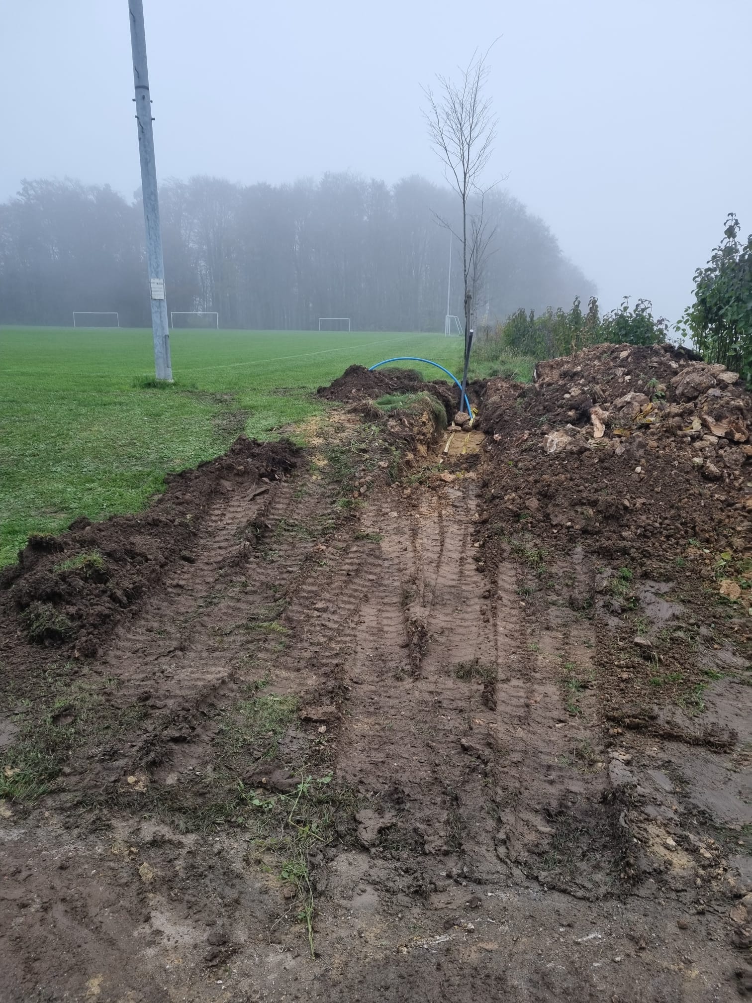 Trotz des wechselhaften Wetters schreiten die Arbeiten an unserem Waldstadion planmäßig voran. Der Glasfaseranschluss für unser Sportheim sowie die Wasserversorgung für den Flutlichtplatz werden aktuell umgesetzt.