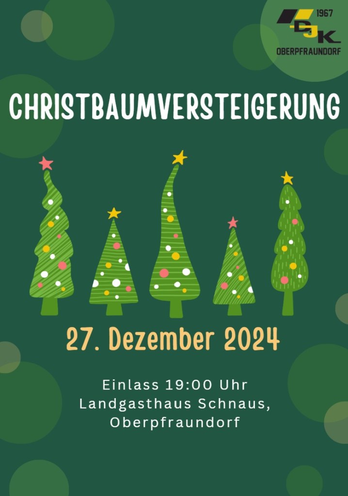 auch dieses Jahr laden wir wieder alle Freunde der DJK-SV Oberpfraundorf zur traditionellen Christbaumversteigerung im Landgasthof Schnaus ein. Neben vielen kulinarischen Schmankerln gibt es gute Laune, Spaß, Unterhaltung und natürlich unseren legendären Versteigerer! Der Ertrag der Versteigerung kommt unserem Verein zugute und soll in die kommenden Projekte und Vorhaben fließen.
