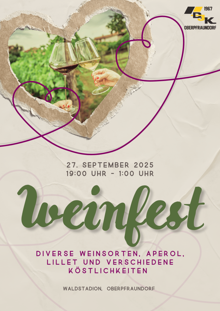 am Samstag, den 27. September, laden wir herzlich zum traditionellen Weinfest im Waldstadion ein! Freut euch auf einen geselligen Abend mit gutem Wein, regionalen Schmankerln und stimmungsvoller Atmosphäre.