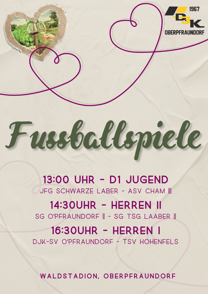 Doch schon vor unserem Festbeginn ist einiges geboten. Unsere Fußballmannschaften sorgen am Nachmittag für sportliches Programm. Den Anfang macht die D1 Jugend der JFG Schwarze Laber. Sie spielen um 13:00 Uhr gegen den ASV Cham III. Im Anschluss spielen unsere Herren II gegen die SG TSG Laaber II. Den Abschluss macht das Derby unserer Herren I gegen den TSV Hohenfels ab 16:30 Uhr. Direkt im Anschluss an die Spiele, ab ca. 19:00 Uhr, startet dann unser Weinfest.