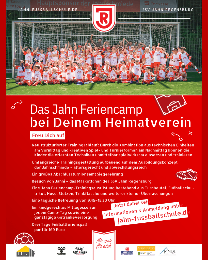 Die Anmeldung für das Jahn Feriencamp erfolgt direkt über die Jahn Fußballschule. Für Mitglieder unseres Sportvereins gibt es 10€ Rabatt.