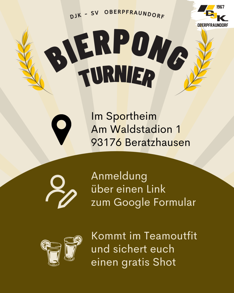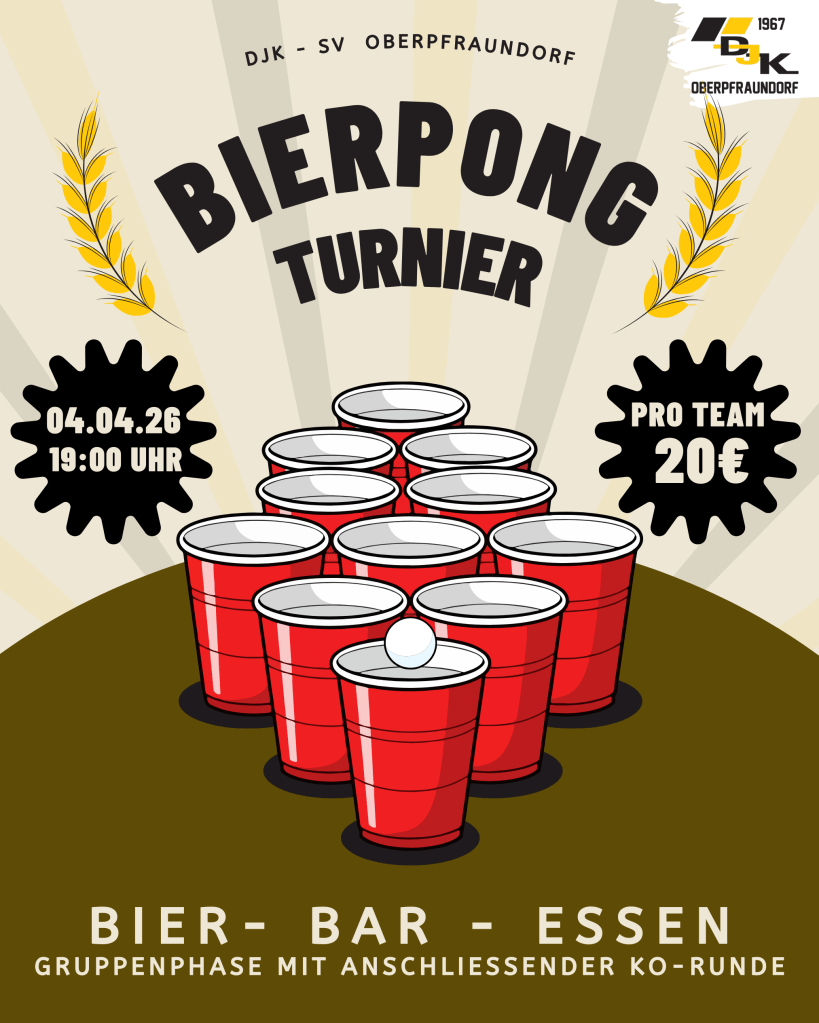 Am Samstag, den 04. April 2026, laden wir zum Bierpong Turnier ein. Ab 19:00 Uhr verwandelt sich unser Vereinsheim in eine Turnierarena, in der Teamgeist, Treffsicherheit und vor allem gute Laune im Mittelpunkt stehen. Egal ob ihr bereits Turniererfahrung mitbringt oder einfach Lust auf einen geselligen Abend mit Freunden habt – bei uns sind alle willkommen.